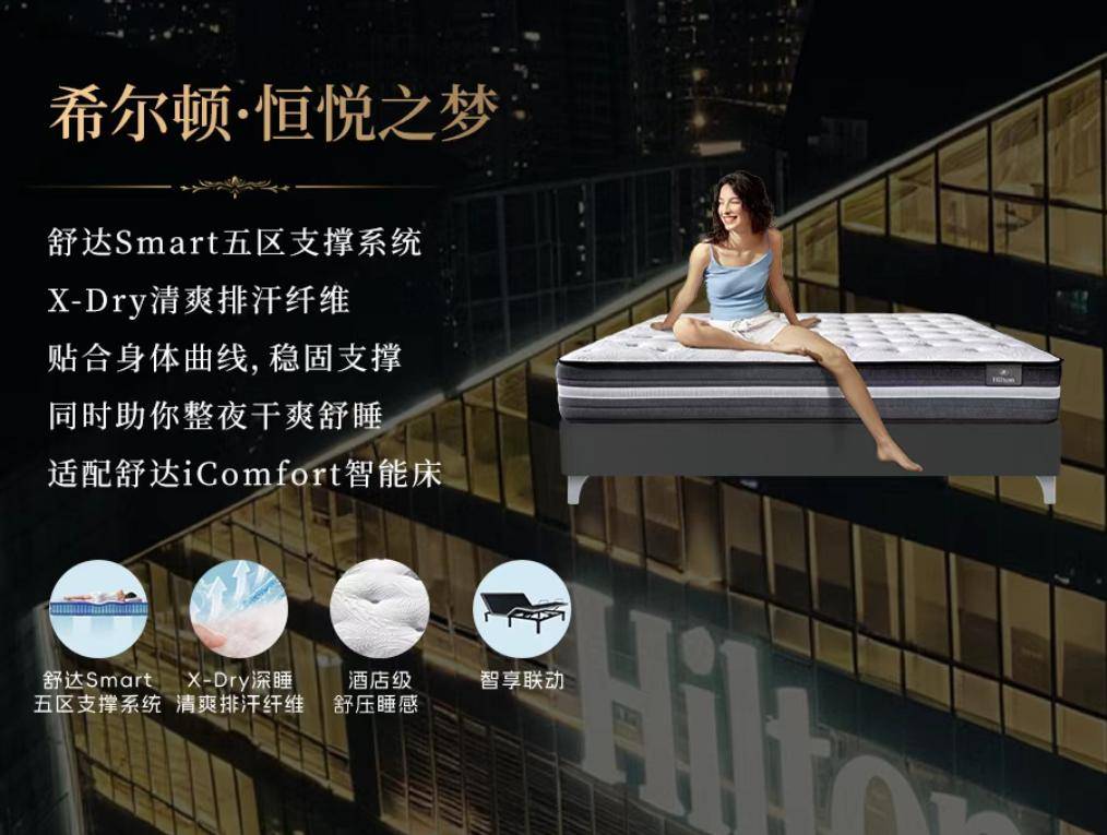 2025年,舒达迈出关键一步:正式推出“希尔顿系列床垫”,将五星级酒店的睡眠标准引入家庭场景。作为希尔顿、万豪、洲际等全球顶级酒店集团的长期战略合作伙伴,舒达依托其在全球高端酒店中积累的真实用户口碑,完成了一次高效的“信任迁移”——消费者在旅途中亲身体验舒达床垫的支撑性与舒适度后,品牌认知便从“陌生”悄然转为“信赖”,进而驱动零售端的主动选择。